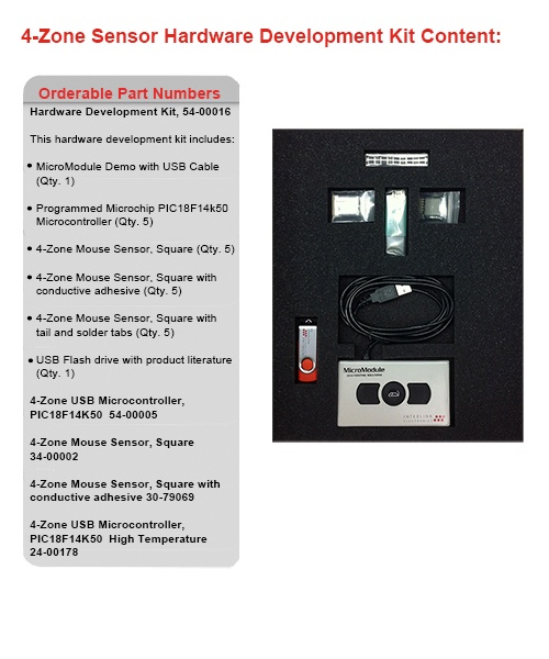 The 4-zone FSR HDK includes a fully functioning demo module which can be easily connected to a PC for evaluation. It also contains additional sensors and programmed micro-controllers as well as full product integration documentation.