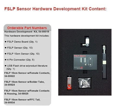 The FSLP Sensor HDK includes a fully functioning demo sensor mounted to a control PCBA, ten FSLP sensors, connectors, and full product documentation.