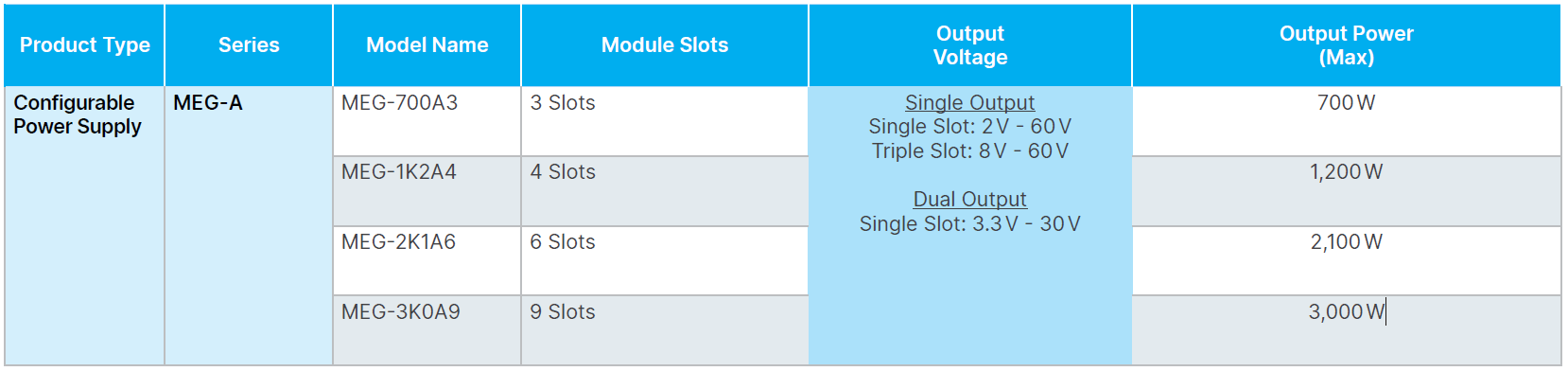 Delta’s MEG-A series output voltage can be configured between 2Vdc to 60Vdc, and output current up to 45A with a single slot single output module.