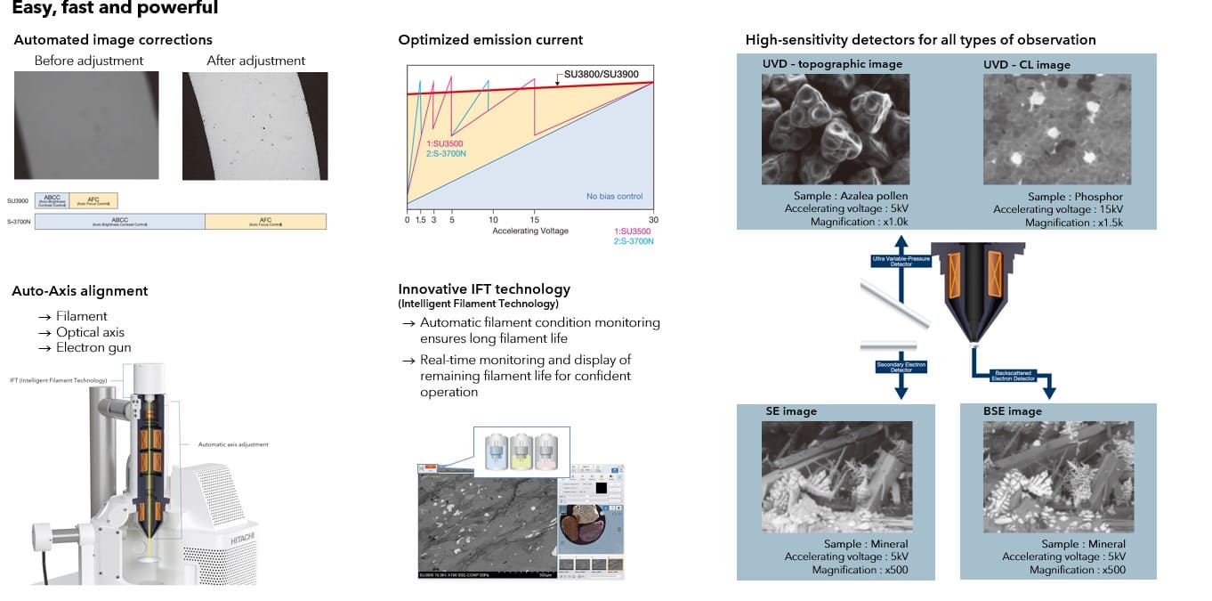 The Hitachi SU3900 MEB incorporates new IFT technology which allows the user to work with a constant and extremely stable emission current for all acceleration voltages. In addition, the software informs in real time of the remaining life of the filament. Lifetime is typically increased by a factor of x3.