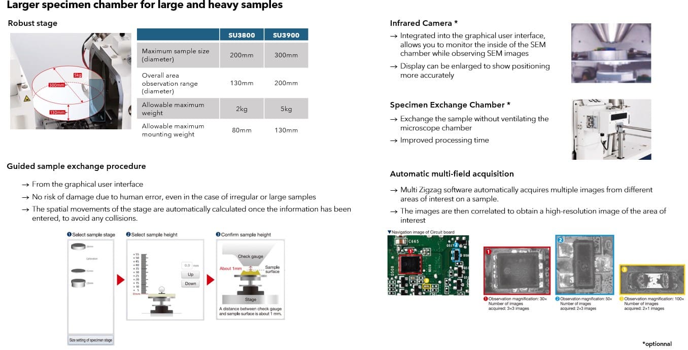 The Hitachi SU3900 SEM is a versatile, high resolution, very large chamber tungsten filament SEM. It offers very high imaging performance – particularly at low accelerating voltages, excellent analytical capabilities and a multitude of upgrade options.