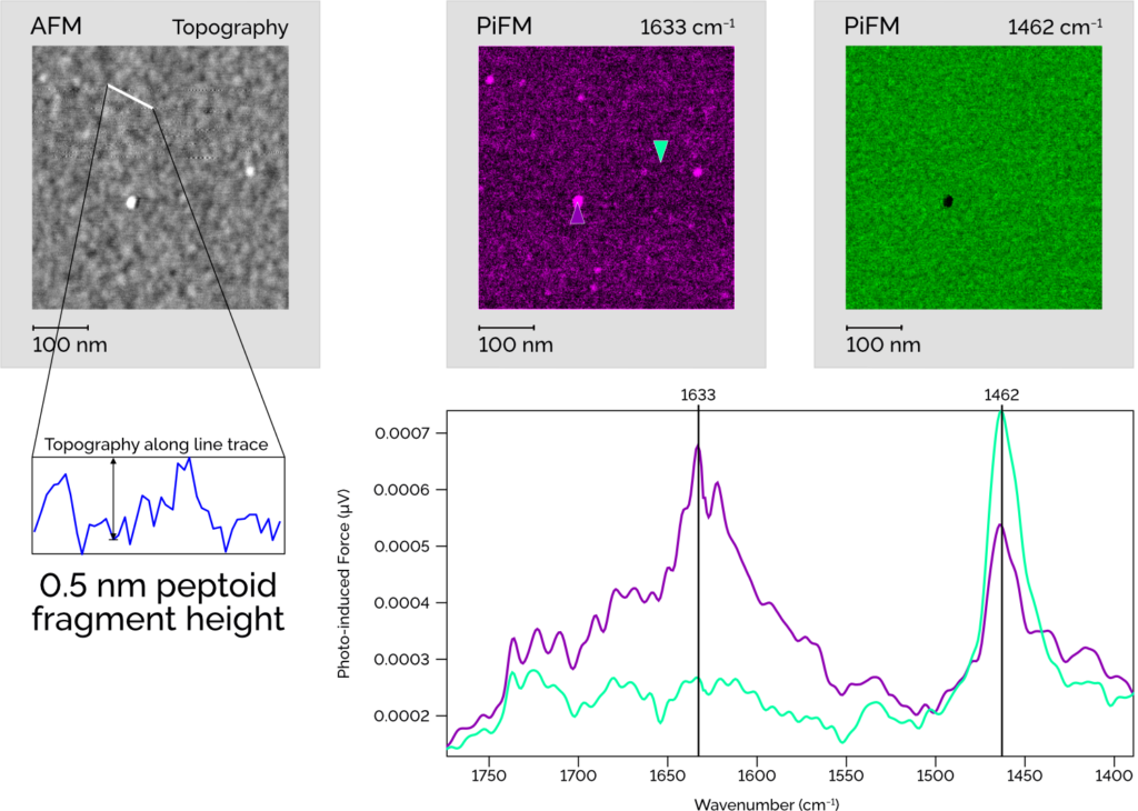 Single-molecule level sensitivity PiF-IR: PiF-IR spectra (magenta and green) show the chemical differences on and off these peptoid nano-sheet fragments. PiFM: PiFM chemical maps are able to detect peptoid fragments that are only 0.5 nm taller than the surrounding material! Scan dimensions: 500 nm × 500 nm × 1.7 nm.