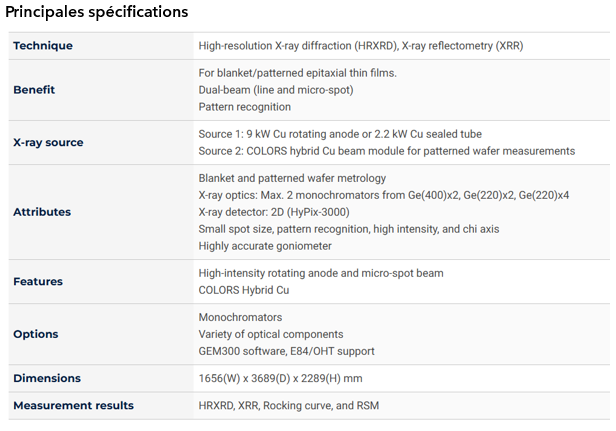 L’XTRAIA XD-3300 Le XTRAIA XD-3300 est un outil de métrologie à rayons X polyvalent qui permet l’analyse non destructive de films monocouches et multicouches sur des plaquettes de 300 mm et 200 mm, lisses ou structurées, avec un débit élevé dans le cadre d’une production à grand volume.